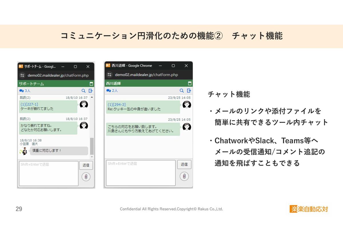 あともう1つはチャット機能です。メールのリンクや添付ファイルをメンバー間で簡単に共有できる、ツール内チャットもございます。もちろん外部チャットへ新着メールの受信通知や、メールにコメントがついたら通知を飛ばす機能もありますので、既存のチャットツールでやり取りしていただくことも可能です。