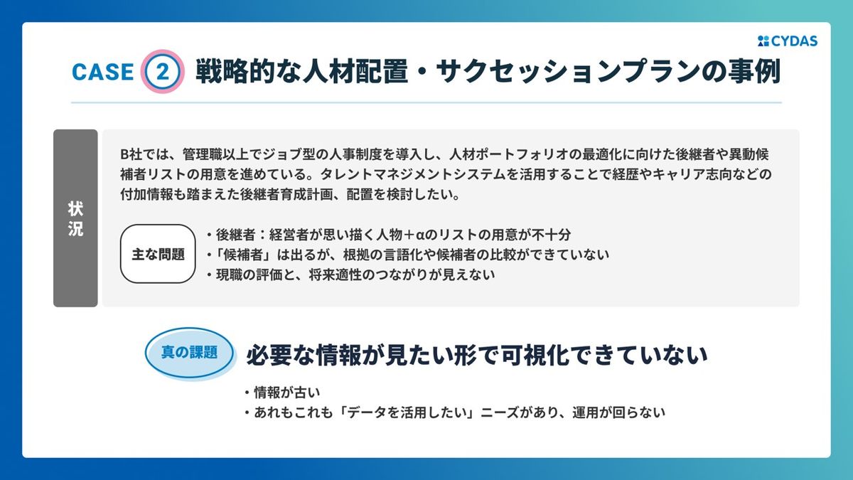 そのため、B社に関しては、必要な人材情報をタレントマネジメントシステムの中に登録するのはそもそもですが、ジョブディスクリプションということで、後継者を選定される重要なポジションにはどういう人たちが必要なのか。そんな定義をしっかり経営層と共通認識を持つことが大変重要になるかなと。