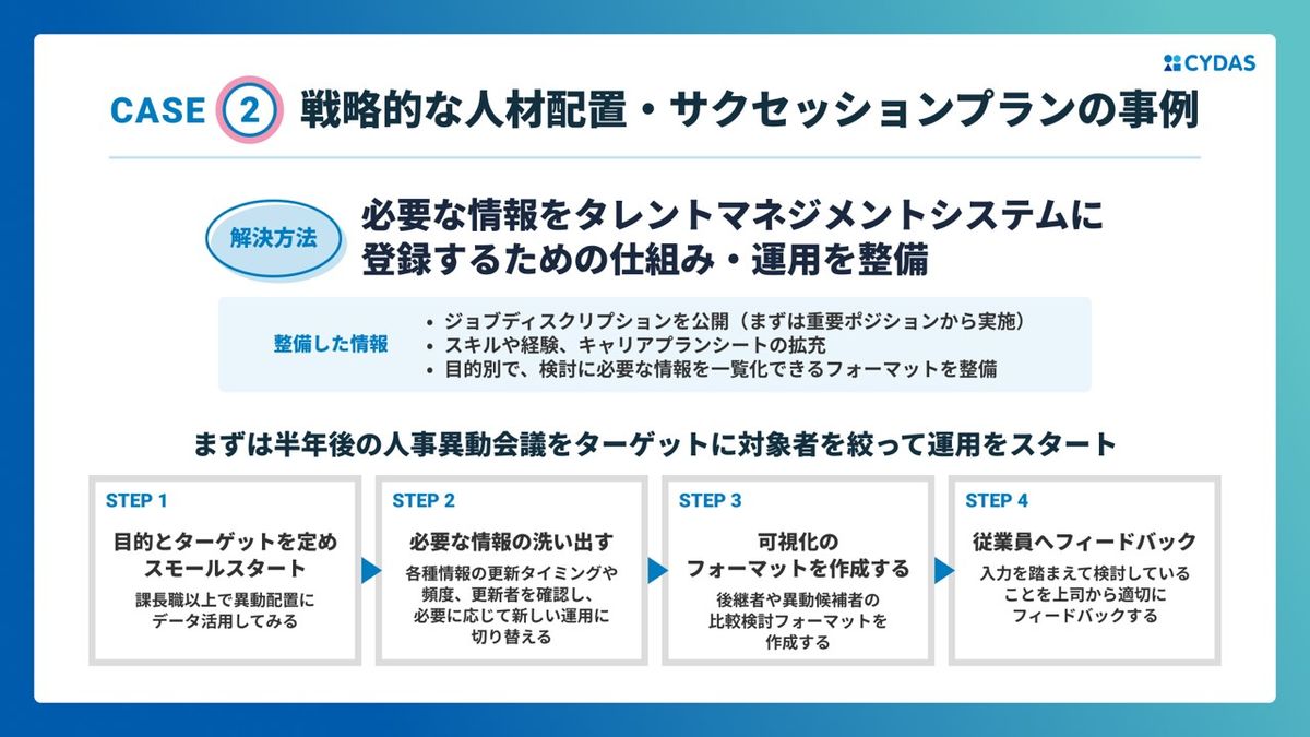 西:それでは2つ目を見ていければと思います。戦略的な人材配置・サクセッションプランの事例です。みなさん、やりたいですよね。サクセッションプランに取り組まれている企業の事例ということで進めていきます。