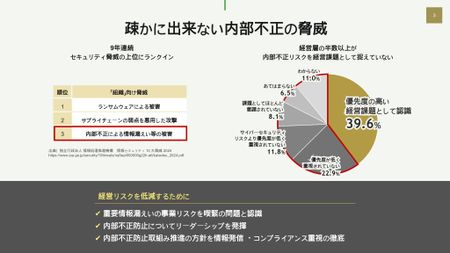 内部不正による情報漏えいはIPAの脅威ランキングで9年連続上位に入り、依然深刻なリスクです。しかし経営層の約6割は優先課題と認識しておらず、対策意識が低下しています。実際には、内部不正が発生すれば調査・賠償・風評被害など、被害はサイバー攻撃と同等の損害をもたらします。本ウェビナーでは、近年の内部不正事例を振り返りつつ、発生要因や有効な対策、さらにITシステムログを活用したリスク可視化と未然防止策を解説。セキュリティ担当者や情報システム部門必見の内容です。