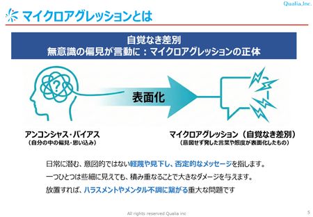 職場での「ちょっとした一言」や「何気ない態度」が、知らず知らずのうちに相手に不快感や疎外感を与えることがあります。これがマイクロアグレッションです。一見小さな問題でも、積み重なることで個人の尊厳や心理的安全性を損ない、離職や心身の不調を引き起こし、組織に大きな損失をもたらします。 本セミナーでは、DEI推進のトップランナー荒金雅子氏が、マイクロアグレッションの具体例と影響をわかりやすく解説。アンコンシャス・バイアスとの関係性や、当事者・周囲が取るべき対応を、弊社の研修・eラーニングコンテンツをベースに、実践的なヒントとしてお届けします。