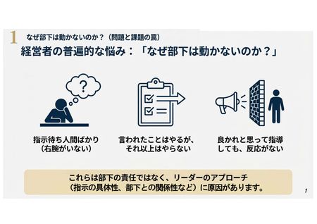 「一生懸命伝えているのに、なぜ部下は思い通りに動いてくれないのか?」 経営者やリーダーが、良かれと思って口にする「課題を解決しろ!」という言葉。実は、この言葉の使い方が、組織の思考を止めてしまう「最大の思い込み」なのです。本セミナーでは、30年以上の会社勤務の中で、実際に30名超の組織を「自ら考えて動く集団」へと変革させた現役管理職が登壇。1年半もの間、正論をぶつけて失敗し続けた実体験から導き出した「組織を動かす仕組み」を紹介します。