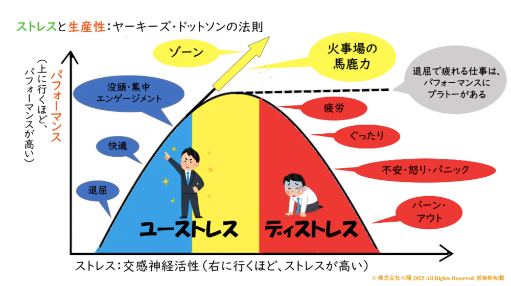 (パフォーマンスが)上がるのか下がるのかはストレスの絶対的な性質や量ではなくて、本人の現在の力量やパーソナリティなど、ストレスを受ける側の個人的な要因によるんですね。