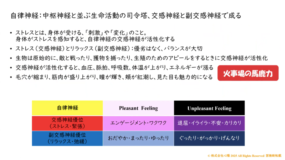 例えば、趣味でホットヨガをする時も体は同じ反応をします。体温が上がって、汗をかいて、呼吸数や脈拍が増えて、血圧も上がっています。交感神経は活性化しています。でも、なぜか爽快ですよね。同じ汗でも、いい汗をかいたと思うか嫌な汗だと思うか。これの違いは感情なんですね。