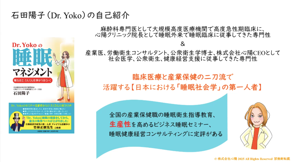 それをきっかけに、病気を治すために患者が集まる病院ではなく、病気じゃない人が働く職場の健康マネジメントにはまってしまい、現在は臨床医療と産業保健の二刀流で睡眠社会学家として、主に仕事をする人の生産性を高める活動をしています。