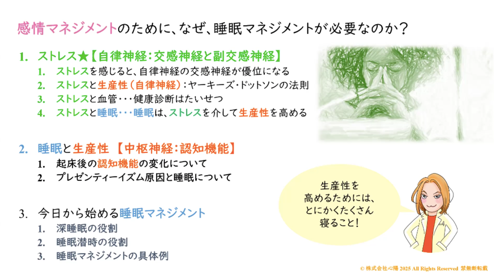 今夜はまず、感情マネジメントのための睡眠マネジメントの手前の「ストレスとは何か?」という話から始めようと思います。ストレスの役割がわかれば、睡眠と生産性の関係が腑に落ちます。睡眠と生産性には、ストレスのほかに認知機能が関係します。感情マネジメントにも認知機能が必要です。