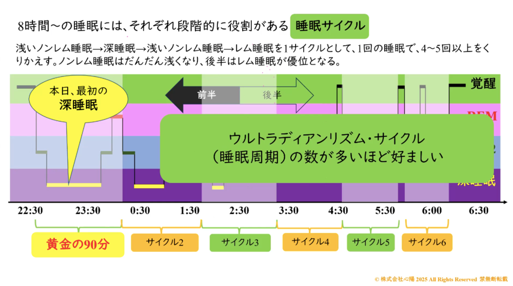 最初のサイクルは、先ほど言ったように最も長い深睡眠を含みますので、本日最初の1サイクル目のことを「黄金の90分」なんて呼ぶこともあります。なので睡眠マネジメントの時には、この黄金の90分を確保することが大事です。