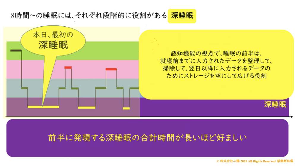 後半は、片付いた脳の中で明日のための仕事を形作っていく時間になってきます。睡眠を大きく分けると、前半と後半で役割がすごく違うよということなんですけれども、全体として、前半に発現する深睡眠の合計時間が長ければ長いほどいい睡眠といいます。