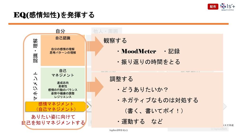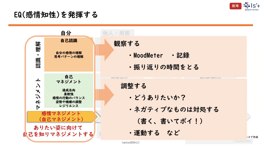 誰もが未経験で複雑なチャレンジである双方から見た事実(Fact)と、「この仕事はつらい」「モヤモヤするんだ」という感情をお互いにきちんと伝え(Emotion/Express)、その上で「では少し時間をとって1on1する」や「他の助っ人を入れよう」など(Solution/Suggestion)の手順で、EQが活用され発達した職場になります。
