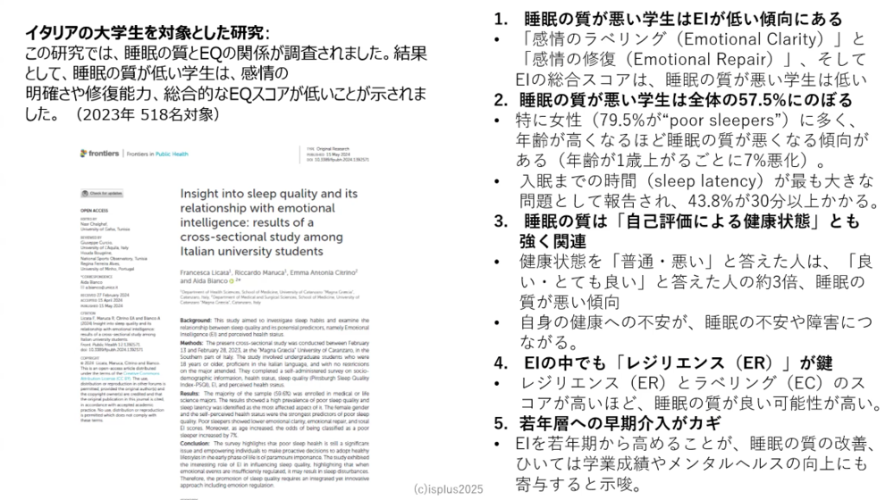 イタリアの大学生を対象とした研究も出ていまして、睡眠とEQには高い相関性がある。その中でも最も相関性があるのは、自己評価、自己認知、そしてやはりレジリエンスの発揮なんですよね。予測どおりではありますが、睡眠の質が悪い学生は成績も悪いというのもこの中でも述べられています。