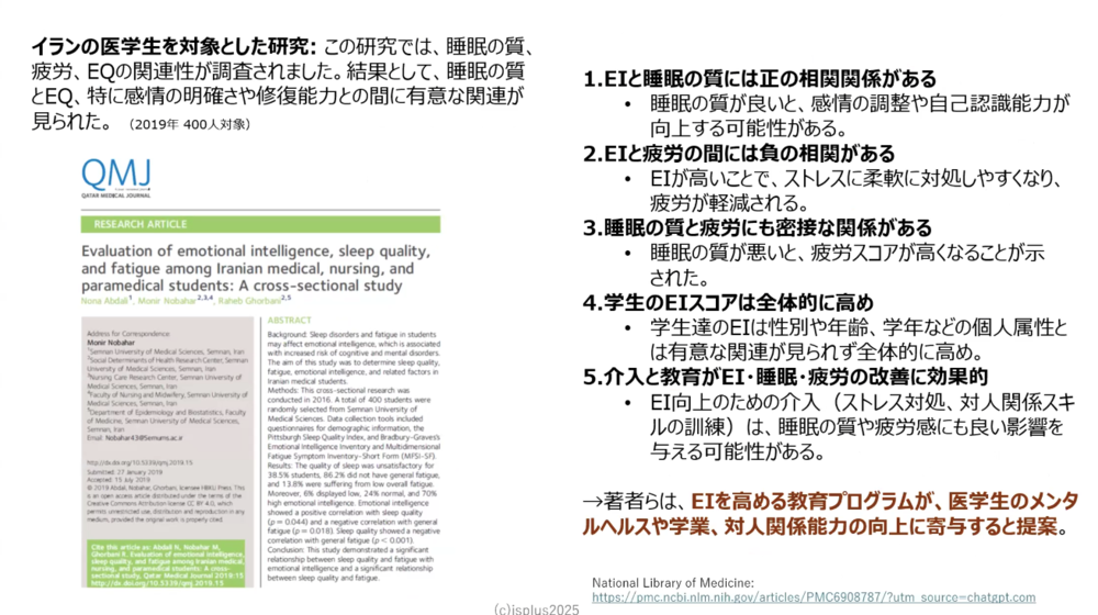 もう1つ、これはイランの医学生の方たちのデータだそうですが、ここの中でもEI(Emotional Intelligence)と睡眠には正の相関性があるよということです。