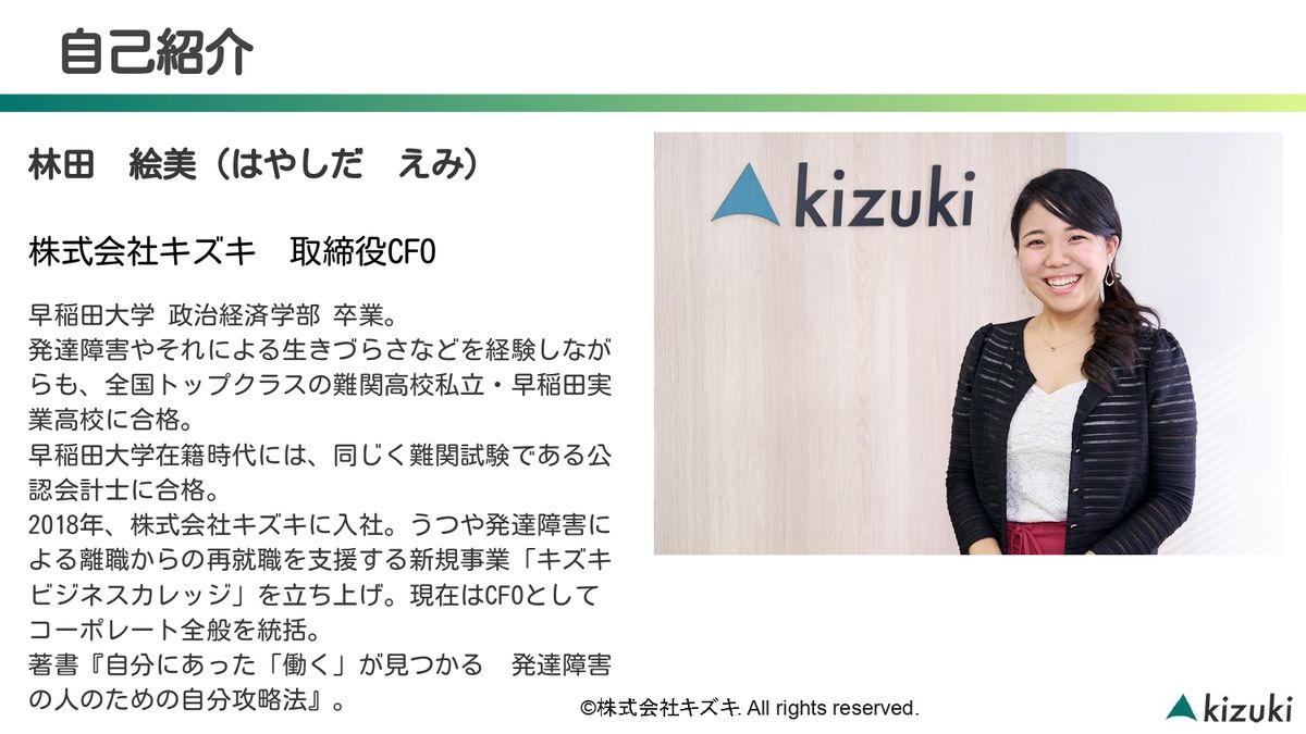 林田絵美氏(以下、林田):主役とご紹介いただいて僭越なんですけれども、私は株式会社キズキ取締役の林田絵美と申します。実は『自分に合った「働く」が見つかる 発達障害の人のための自分攻略法』という本を執筆しまして、今回このようなイベントを企画させていただきました。