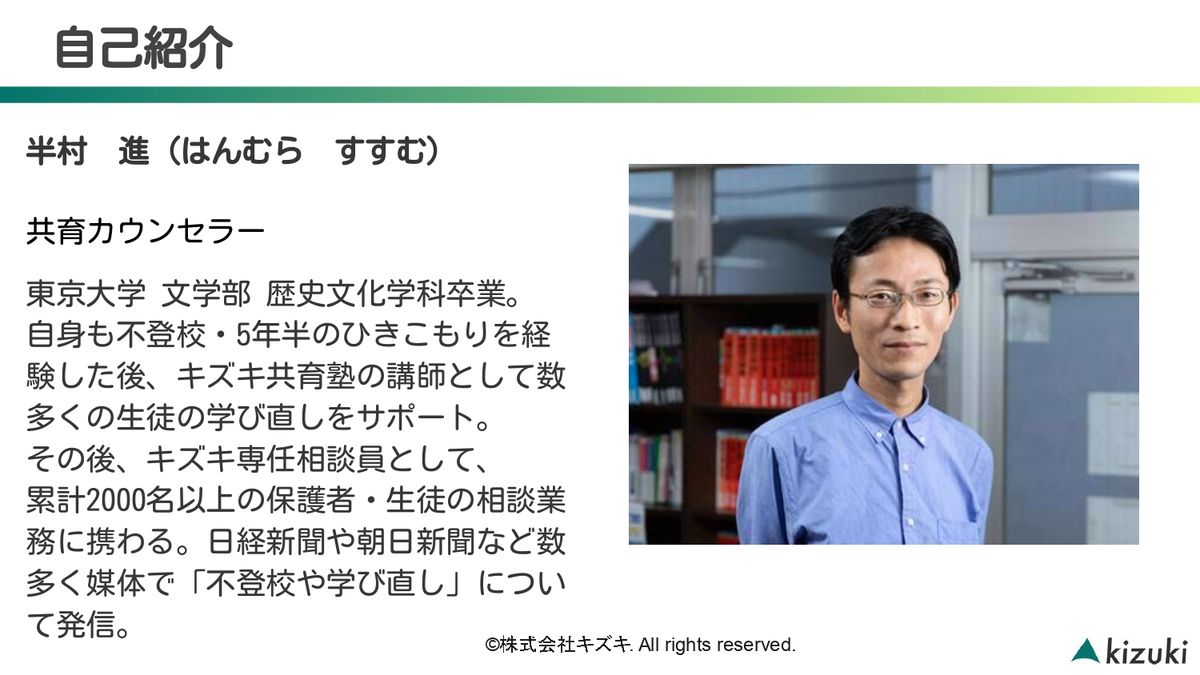 半村進氏(以下、半村):まず自分から少しだけ自己紹介をさせていただきます。キズキの半村進と申します。キズキの創業間もない頃からいるスタッフなんですけれども、実は自分もいろんな偏りや紆余曲折がありました。不登校、そして5年半ぐらい引きこもっていた経験もあります。