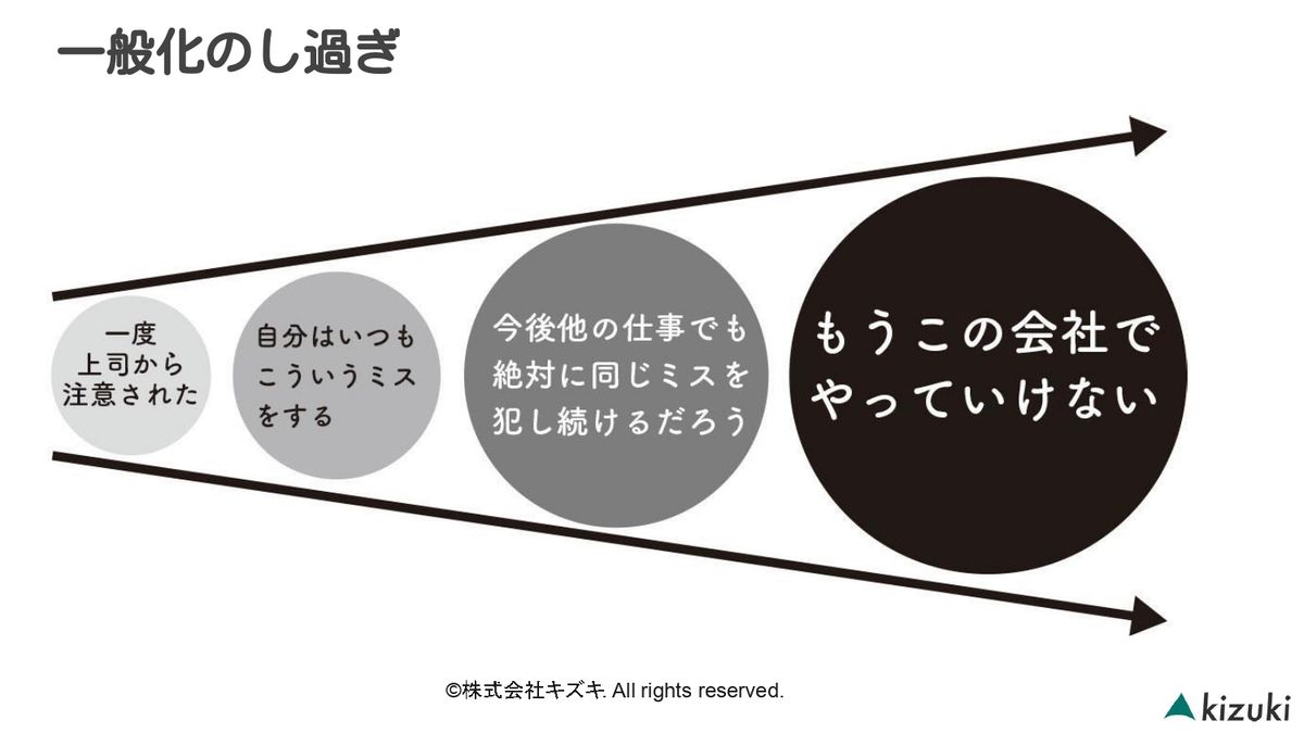あと「一般化のしすぎ」ですね。勉強に置き換えて説明すると、例えば先生から一度怒られたとか注意されたとか、友だちと一度喧嘩してしまったとなった時に、「いつも自分はこういうことをしてしまう」「そうしたらもう他の環境、この後の学校生活でも絶対同じことを犯し続けてしまうだろう」「もうこの学校ではやっていけない」という。