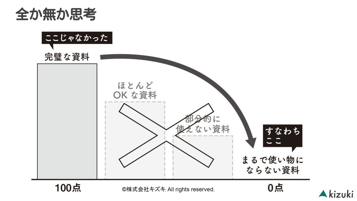 例えば仕事の場でも資料を作る時とか。100点の資料を自分の中の理想としちゃって、そこに1ミリでも届かなかったら、もうこの資料は使えないという思考になってしまう。もしかしたら一部直せばまた使えたかもしれないけれども、もう最初からやり直しだという思考になってしまう。こういう思考回路を「全か無か思考」といいます。