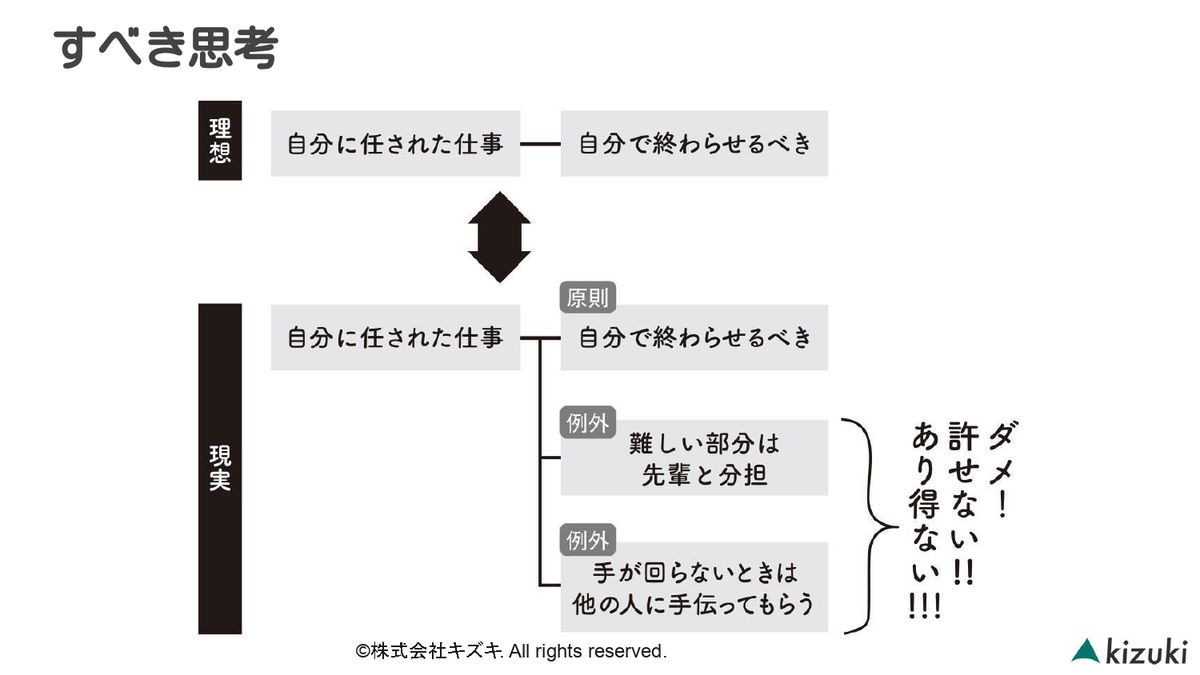 あるいは、「すべき思考」。これは聞いたことがある方もいらっしゃるかもしれないですね。例えば自分に任されたことは自分で終わらせるべきだといつも思っているとします。ただ、それは原則なんだけれども、実際には難しいところは誰かと分担したり、手が回らない時は他の人に助けてもらったりすることもあると思うんですけど。