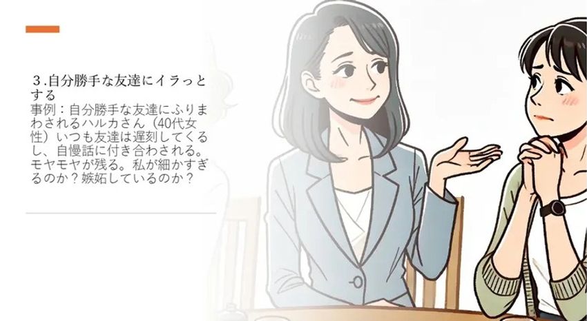 中島美鈴氏:次のケースです。次は自分勝手な友だちにイラッとするという友人関係のお悩みです。(スライドの)右のほうにいる女性がハルカさんです。