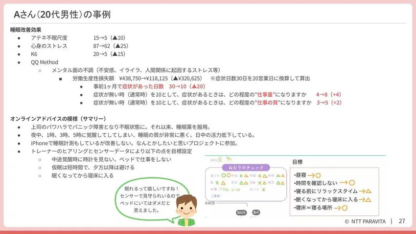 猪原祥博氏(以下、猪原):次は、例えばAさん(20代男性)はどんな感じで睡眠改善して、プレゼンティーズム(心身の不調によってパフォーマンスが落ちた状態で働くことによる損失)が改善したのか。ちょっと時間も押しているんですが、これも簡単にご説明させていただきます。