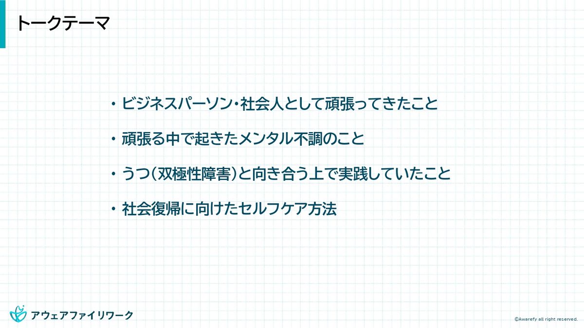 小川:(スライドを示して)トークテーマは、大きく4つほど用意しております。まずは、がんばってきたところ、何をやられてきたかという話。それから、メンタル不調でどのようなかたちになったかですね。それから、うつ、双極性障害と向き合う上で、どのようなことを実践されていたか。そして最後は、社会復帰に向けたセルフケア方法になっています。