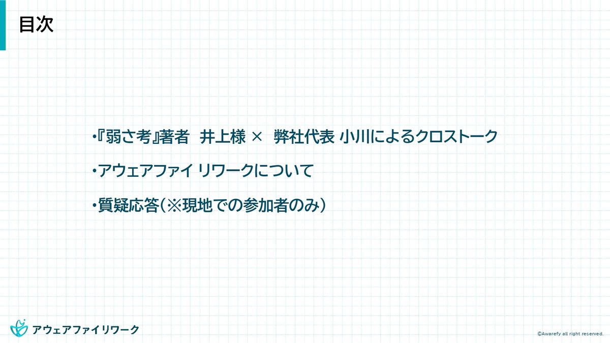 私は株式会社Awarefyの代表をしております小川(晋一郎)と申します。今日はご案内があったかと思いますが、
