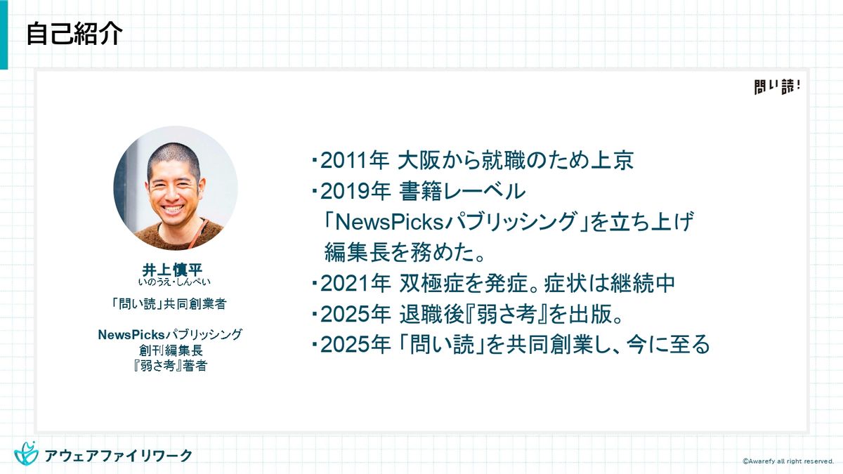 『強いビジネスパーソンを目指して鬱になった僕の 弱さ考』の著者であり、株式会社問い読の共同創業者の井上慎平さんをお招きして、いろいろとお話をうかがっていきたいと思っております。よろしくお願いいたします。