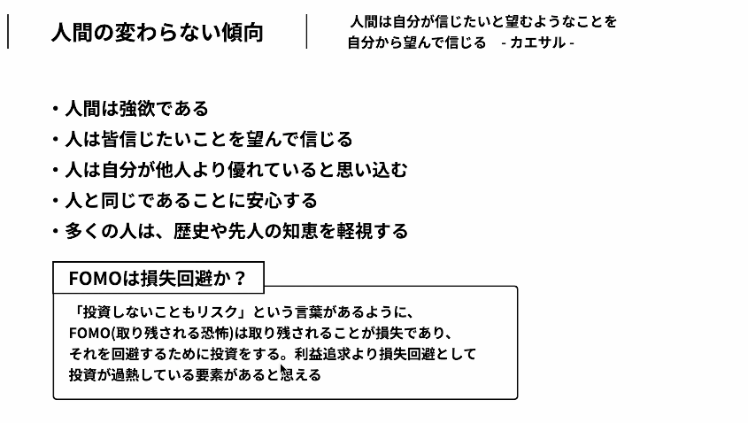 だからこそ僕は、常に同じことが繰り返されていくんだろうと思っていて、何よりも「FOMO = Fear Of Missing Out」」という、取り残される恐怖ですね。これはある種、「みんながお金持ちになっていくのに、自分だけお金持ちにならないわけにはいかない」ということですよね。