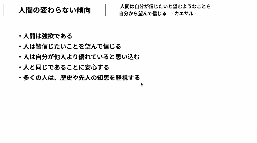 そしてその下、人間はみんな、信じたいことを望んで信じるなと思います。(ガイウス・ユリウス・)カエサルですね。2000年以上前に言われた言葉ですが、「人間は自分が信じたいと望むようなことを自分から望んで信じる」と言っているとおり、これは行動計画学では「確証バイアス」とかって言われますね。