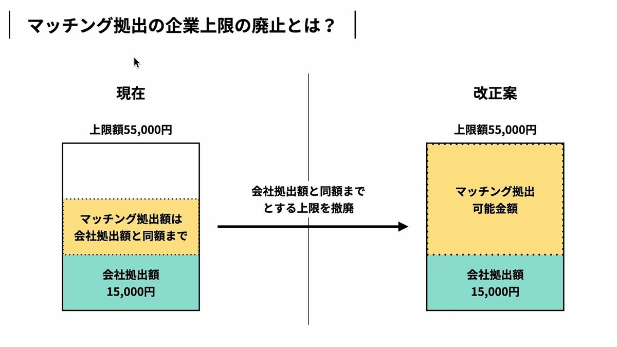 あんまりにもマッチング拠出が少ないから、それだったらマッチングせずにiDeCoをやろうかなというケースがあったんですが、この会社拠出額を上限とするという、この上限を撤廃したので。2026年の4月からは会社が出しているお金がいくらであろうと、55,000円の枠があったら、残り部分は全部マッチング拠出でお金を出していいですよと変わるんですね。