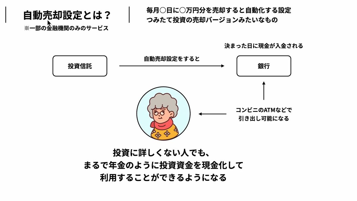 なので今お話ししたとおり、こういう設定をかけておくと、投資に詳しくない人でも年金のように(使えます)。年金って2ヶ月に1回振り込まれる。それを引き出すのは実際に高齢者の方でもやられているので、それくらいはできるかなと思います。