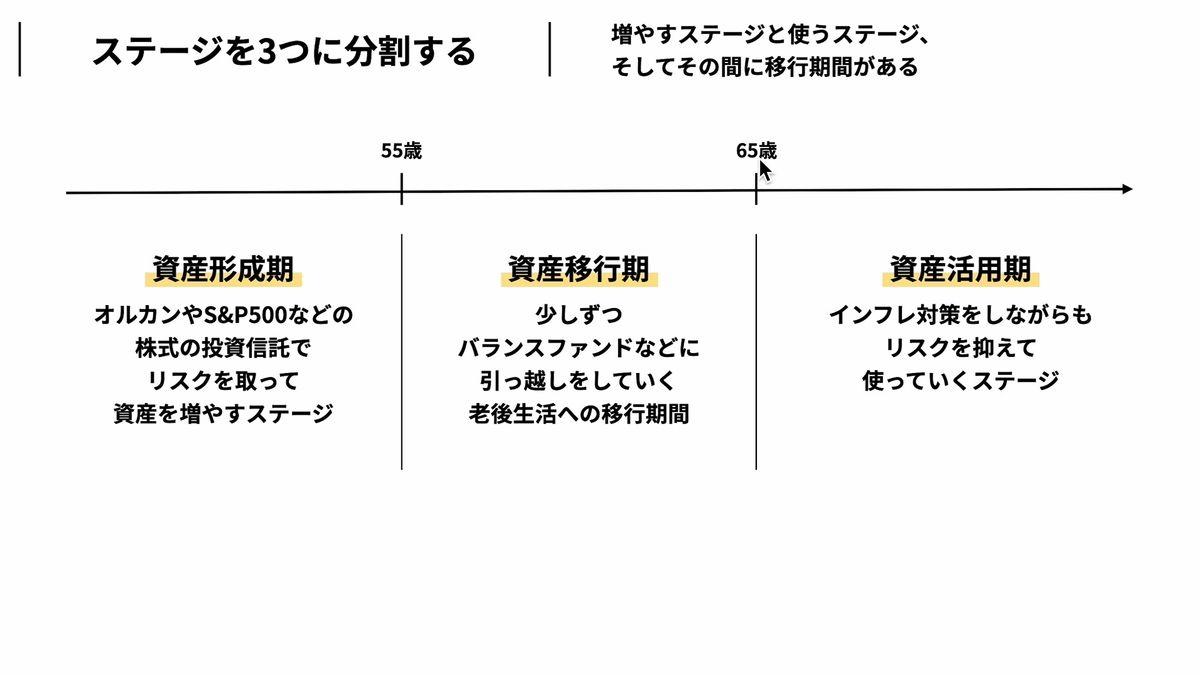ただ実際に「今オルカン買ってます」とか「S&P500買ってます」という方。僕は実際に自分でリバランスしながらポートフォリオを組んで運用しているので、まさにこの資産形成期の段階に入っているわけなんですけれども。