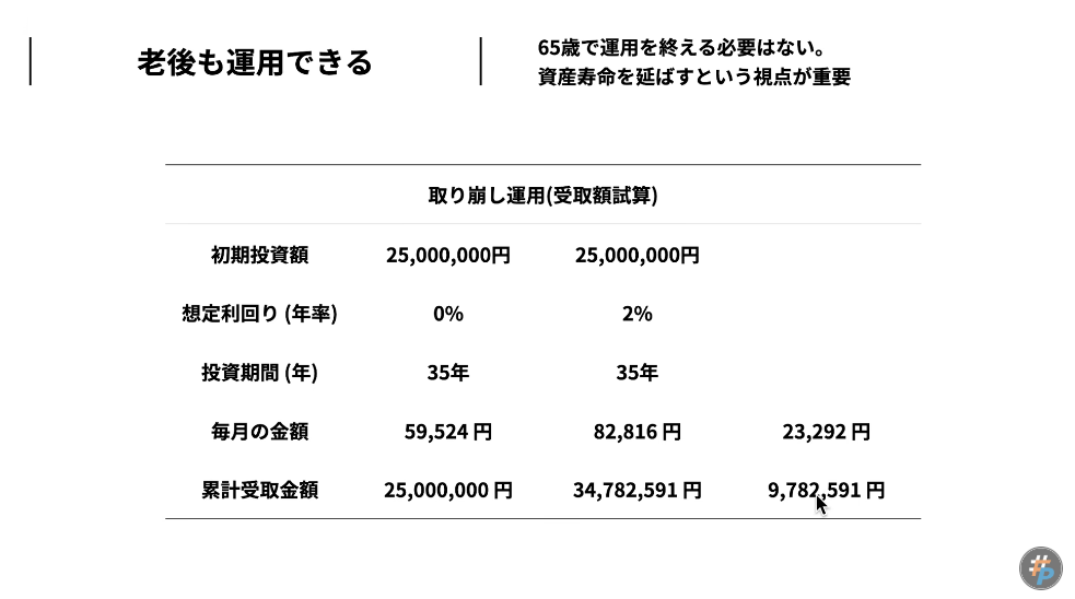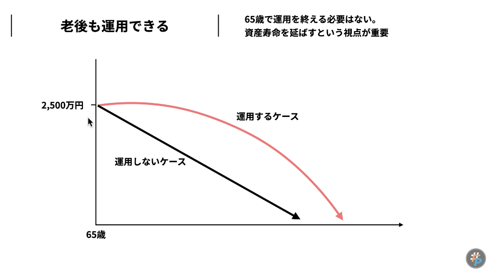 さらに言うとですね、老後も運用ができるというのは必ず理解しておいていただきたいと思います。例えば65歳に2,500万円が必要だとか、「65歳までにいくら!」っていう目標を考えるわけですけど。65歳に2,500万円を用意できた方が、いきなり全部の投資信託を売って現金化するわけではないよね。当然、ある程度は運用しながら取り崩していくわけですね。