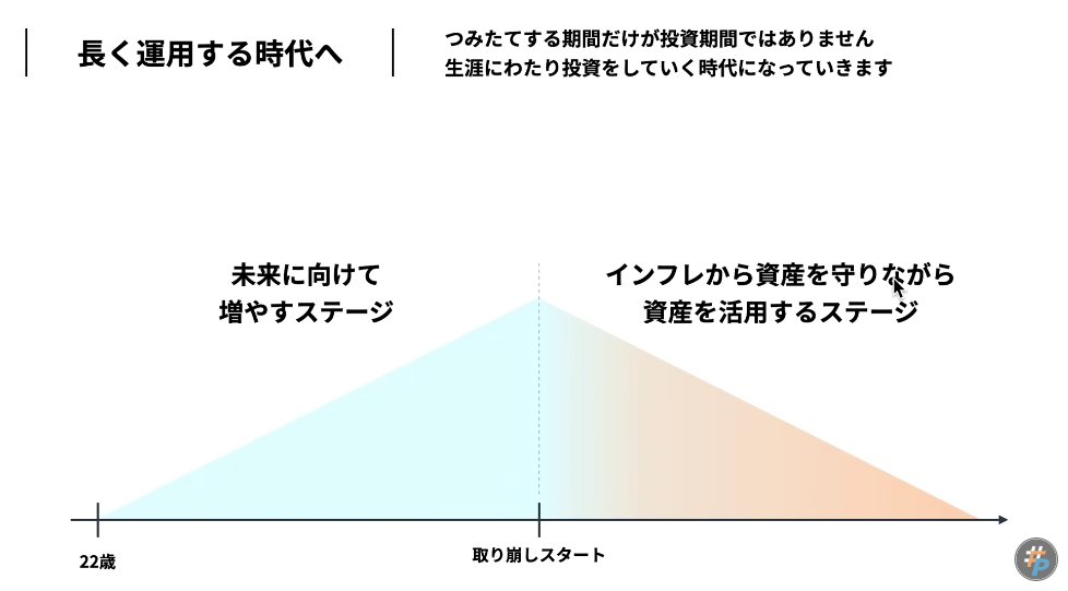 そこに向けてですね。まだ今50代で、あと10年ぐらいあるというんだったら、投資に慣れるには十分な期間だと思います。ざっくりと、未来に向けてお金を増やすステージ、働いている間にお金を育てていく期間ですね。取り崩しをスタートさせたら、今度はインフレからある程度の資産を守りながら、かつ、資産を活用するステージに入っていきます。