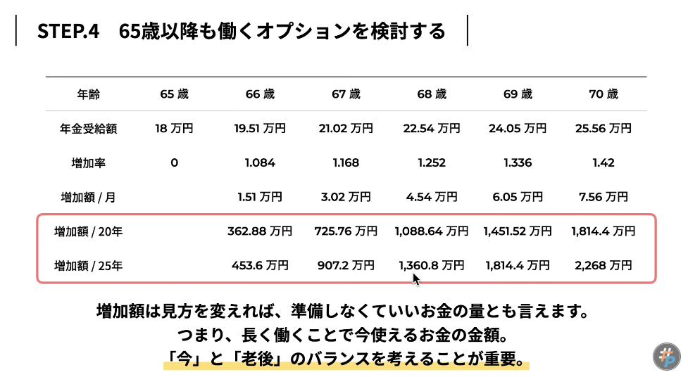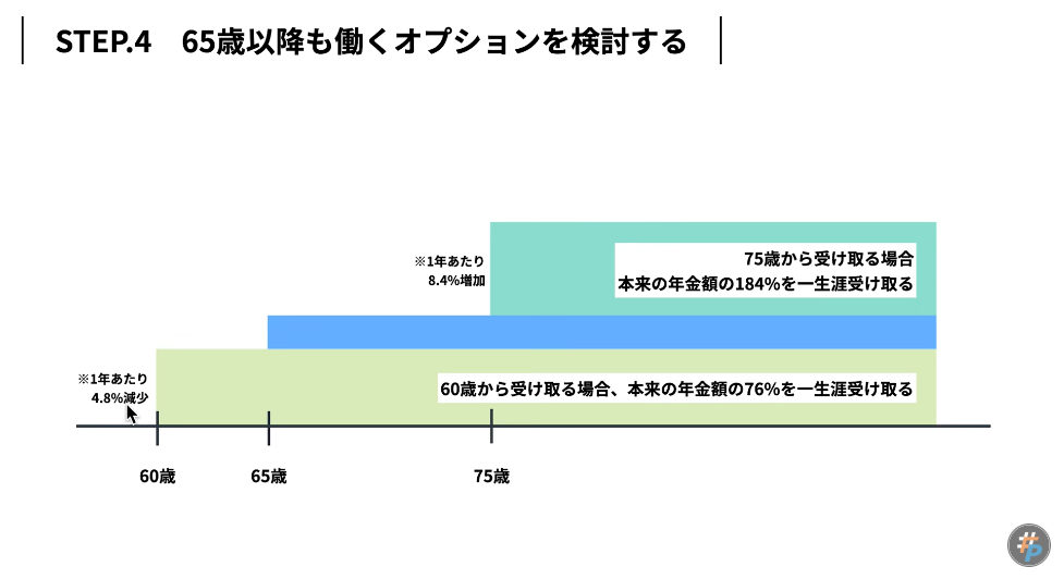 「これはちょっと厳しいな」と思われる場合は、いろんな方法でこの必要な金額を小さくしていく必要があるかと思います。それはなにかというと、ステップ4になります。65歳以降も働くオプションを検討されるといいかなと思います。これ、僕はよく「オプション」って言うんですね。それはなぜかといったら、年金は65歳の支給開始ですけど、みなさんが望めば別に60歳からでも受け取れるわけですね。