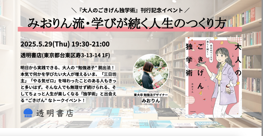東大卒・勉強法デザイナーのみおりん氏による著書『自分のペースで楽しく続く! 大人のごきげん独学術』の刊行記念イベントが、東京・蔵前の独立系書店「透明書店」にて行われました。