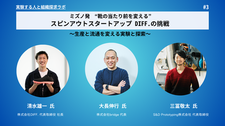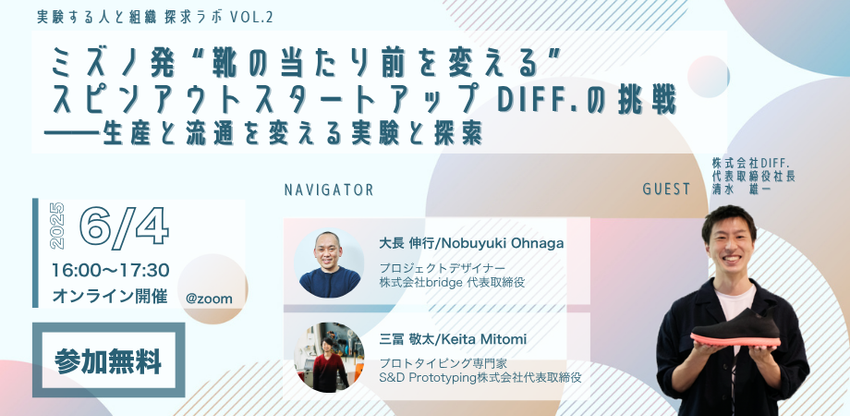 左右別サイズ/片足購入を可能にするシューズサービスで注目を集める DIFF.。 同社は ミズノ の社内提案制度からスタートし、2022年10月にスピンアウト。清水雄一代表は、ミズノから「出向起業」という形で外に出て、「靴の個別最適化」というゴールを目指し、 生産・流通モデルの再設計 に挑んでいます。 本セミナーでは清水氏を迎え、 ・モノづくりの実験 ─ 足型計測・3Dプリント・受注生産 ・バリューチェーンの実験 ─片方づつの購入を可能にする流通改革 ・組織の実験 ─ 大企業とスタートアップの両サイドからみえてきた実験力を高めるヒント を深掘りし、いま人と組織に求められる「実験・探索力」をみなさまと共に考えます。