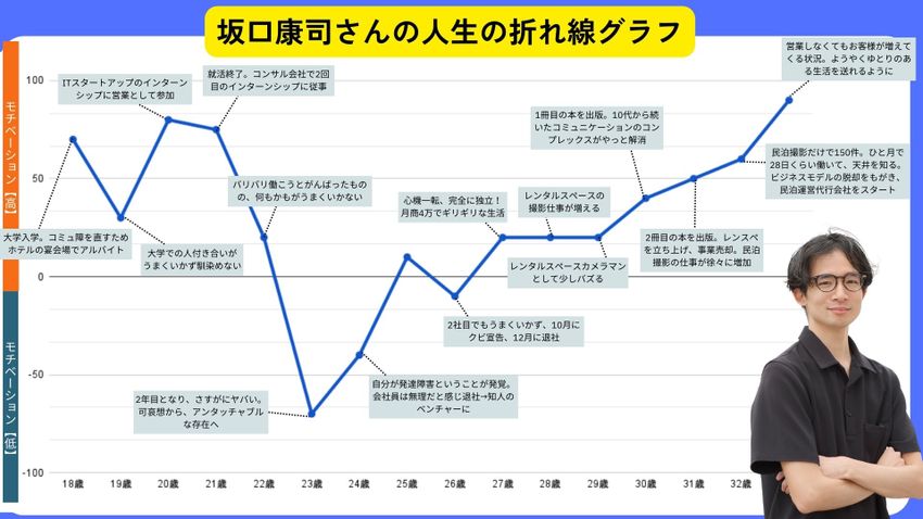 本企画、「キャリアをピボットした人の哲学」では、インタビュイーにこれまでの人生を折れ線グラフで振り返っていただき、その人の仕事観や人生観を深掘りしていきます。 今回は、『会社員を2度クビになった発達障害の僕が、月100万円を稼げるようになった方法』著者の坂口康司氏に、今までの人生を振り返っていただきました。