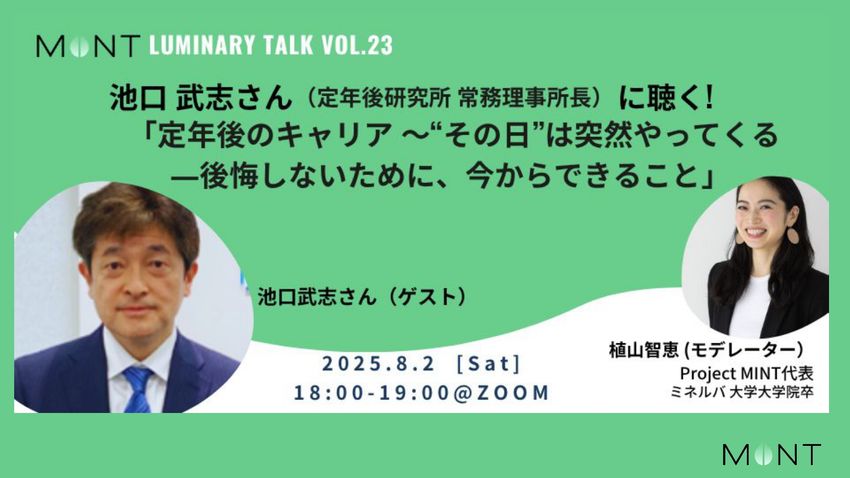 誰しもいずれは、そして気づかないうちに突然やってくる「定年退職」を見据え、その後の判断を後悔しないためにどのようなことが日常やキャリアに取り入れることができるのか。Project MINT代表の植山智恵氏と一般社団法人定年後研究所の池口武志氏が語りました。