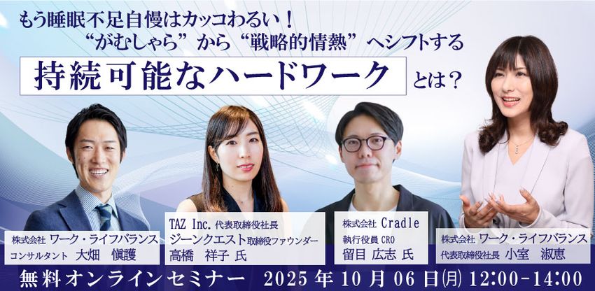 20代・30代で成功したい若手社会人こそが身につけたい、「持続可能なハードワーク」のスキル。長時間労働ではなく、チームで協力して成果を出し、私生活の自己実現も存分に味わう人生のヒントとなるシンポジウムが開催されました。基調講演では、株式会社ワーク・ライフバランス代表取締役社長の小室淑恵氏が語ります。