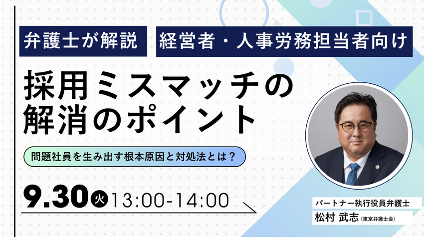 本セミナーでは弁護士の目線から、 ①採用選考の過程でのリファレンスチェックの活用方法・チェックポイント ②問題社員化してしまった際の対応方法のステップ ③ミスマッチに備えた社内制度設計の勘所 を事例を踏まえ60分で解説いたします。