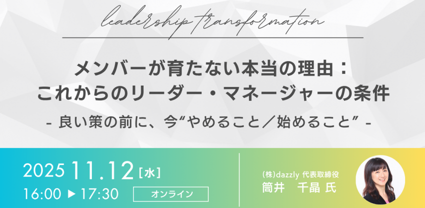 IT/DX推進や組織変革の現場で、「メンバーが育たない」「任せたいのに任せられない」「指示しても動かない」といった課題に直面していませんか? このセミナーでは、旧来型の指示・管理型マネジメントの限界を明らかにし、これからのリーダー・マネージャーに求められる“スタンス”を問い直します。 特に、変化の激しい現代において、リーダー自身が「何をやめるか/何を始めるか」を見極め、迷いながら選び取る力が不可欠です。本セミナーでは、問いを通じて、現場での実践につながるヒントを提供します。
