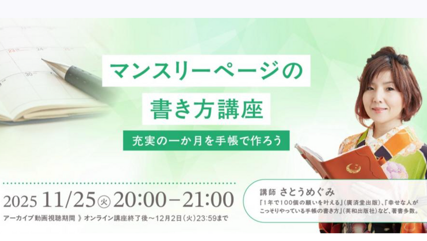 手帳を用い、時間を有効に使って、自分の夢や願いを叶える方法「手帳セラピー」を考案したさとうめぐみ氏が、充実の1ヶ月をつくるためのマンスリーページの書き方をお伝えします。