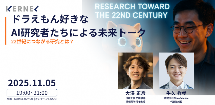 「一夜限りのドラえもんが好きなAI研究者たちのトーク」では、感情や創造性を探る人工知能、身体をもつ知能を追求するロボティクス、そして人に寄り添うテクノロジーの研究など、最前線で未来を形づくるAI研究者たちが集結します。 テーマは“22世紀につながる研究”。研究室で進むAIによる知覚・創造・身体制御の進化から、実験の自動化、社会実装、倫理・共生まで、AIが現実世界に溶け込む過程とその先にある可能性を、トップランナーたちが科学的視点からひもときます。