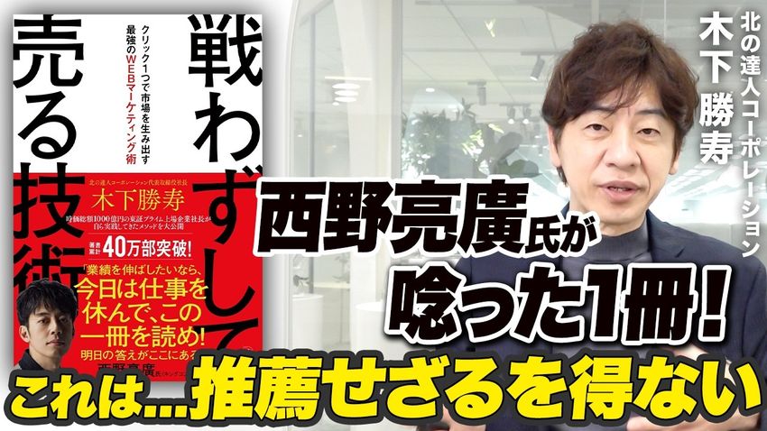 一代で東証プライム上場を成し遂げた木下勝寿氏の仕事術や、北の達人コーポレーションの社員の働き方などを通して、「リアルな北の達人コーポレーション」をお届けする「北の達人チャンネル」。今回は木下氏の著作『戦わずして売る技術 クリック1つで市場を生み出す最強のWEBマーケティング術』のポイントを、著者自ら紹介します。