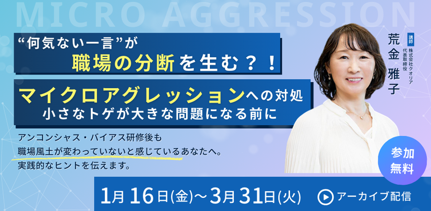 職場での「ちょっとした一言」や「何気ない態度」が、知らず知らずのうちに相手に不快感や疎外感を与えることがあります。これがマイクロアグレッションです。一見小さな問題でも、積み重なることで個人の尊厳や心理的安全性を損ない、離職や心身の不調を引き起こし、組織に大きな損失をもたらします。 本セミナーでは、DEI推進のトップランナー荒金雅子氏が、マイクロアグレッションの具体例と影響をわかりやすく解説。アンコンシャス・バイアスとの関係性や、当事者・周囲が取るべき対応を、弊社の研修・eラーニングコンテンツをベースに、実践的なヒントとしてお届けします。