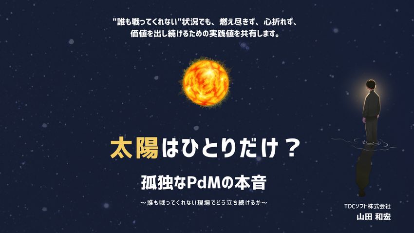 プロダクトマネージャー(PdM)が日々直面する「孤独」に焦点を当てます。意思決定の重さ、熱量のギャップ、板挟みの葛藤、誰にも相談できない現実——PdMは、組織の中で“太陽”のように照らす存在でありながら、実は誰よりも孤独を抱えていることがあります。このセッションでは、「完全に同じ熱量の仲間が増えることはない」という前提のもと、PdMが現場で立ち続けるための仕組みを探ります。