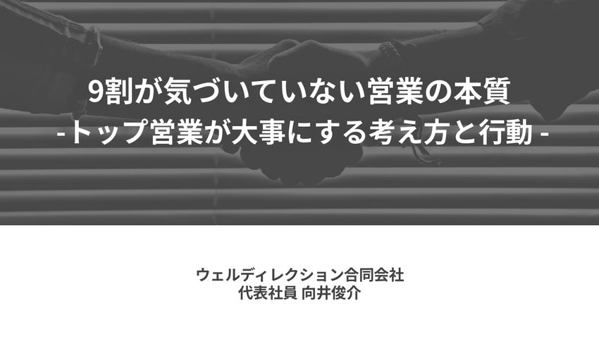 セミナーイベント「日本一シビアな、数字で語る業績向上サミット」より、ウェルディレクション合同会社 代表社員の向井俊介氏が「9割が気づいていない営業の本質 -トップ営業が大事にする考え方と行動」をテーマにした営業戦略セッションをご紹介します。