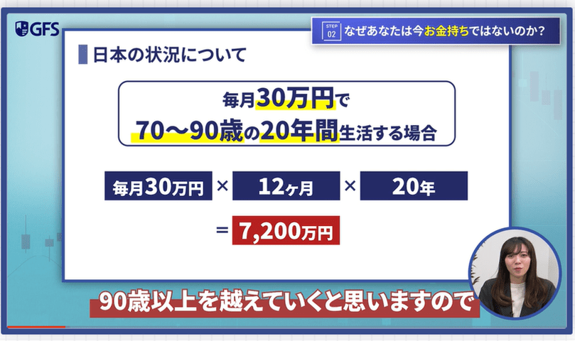 でも動画を見て、焦ったのですが、政府が掲げているインフレ2%の目標インフレのことも考えると「7200万円」の資金が必要みたいです。