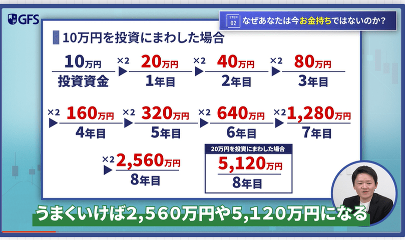 まず手元の10万円で投資をして、毎年2倍にしていけば、8年後には5120万円になるという計算になります。