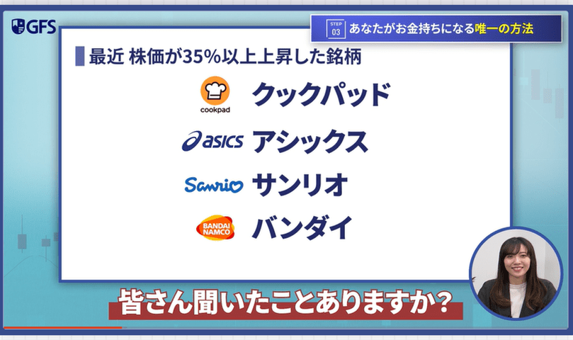 例えば画像にあるようなクックパッド、アシックス、サンリオ、バンダイなどは35%以上の値上がりをしたみたいなんですが、そういう株を見抜くことができれば、効率よく投資ができます。