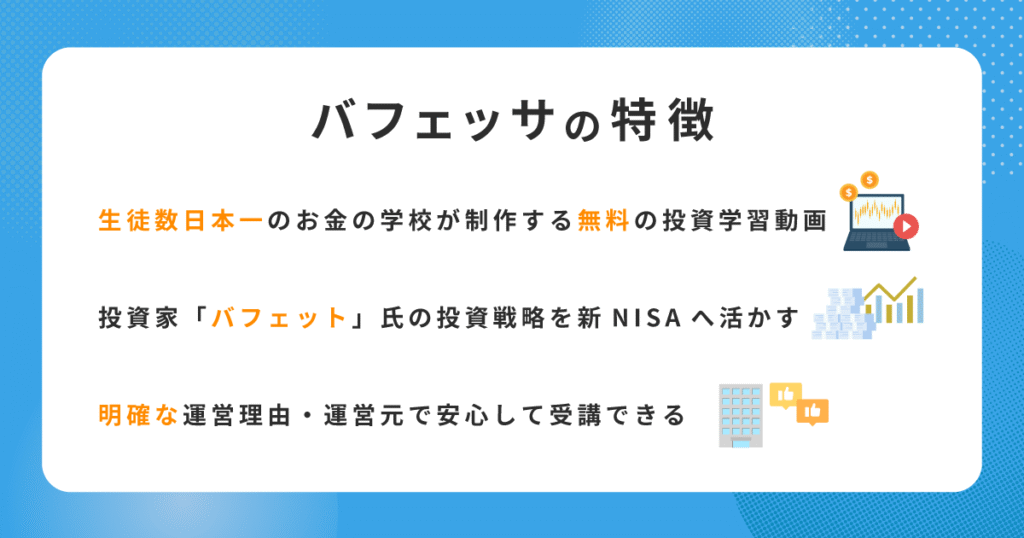 投資講座のバフェッサには、主に次のような3つの特徴が挙げられます。